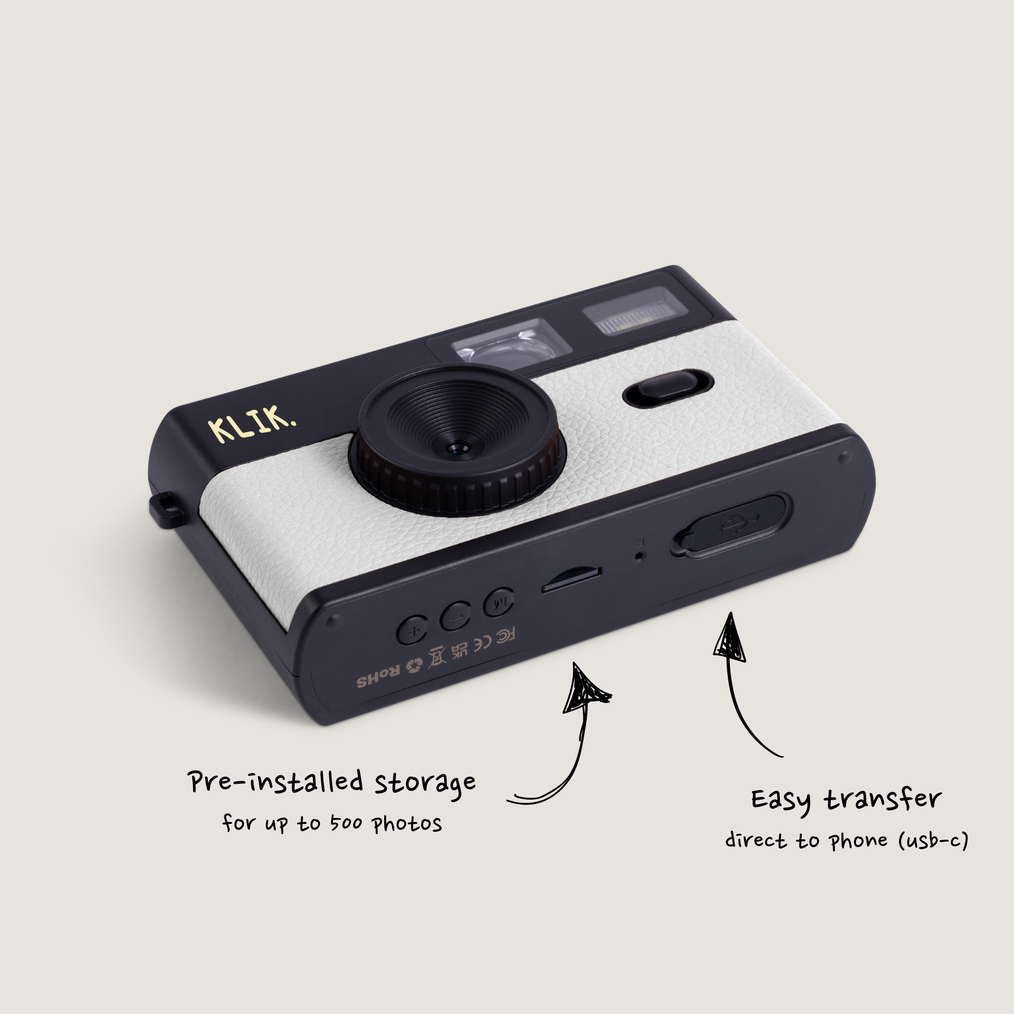 Pre installed with every KLIK camera are 3 unique retro filters; Classic, Retro and Mono.